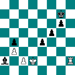 - 这里有个例子。在下面的局势中,黑象被白兵包围,不管黑的怎么走,象总是会在几步内被吃掉;例如白车可以沿着h2-h1-a1-a2吃掉象。这是一个8层深的变化,那么假设黑方的程序也搜索8层。可能当前局面对黑方来说,最好的走法就是用象换兵,即象吃掉兵,兵吃掉象。在后面的残局里,黑方的三个连兵足以战胜或守和白车。【译注:其实守和的希望也不大,译者认为黑方还是会输掉的,因为白王的位置非常好,可以独挡三黑兵,使得白车有时间拔掉b线的黑兵。】但是程序搜索8层,很有可能会挺黑兵将军白王。白必须应对(例如自己来吃掉兵),这个应对使得丢象被暂时避免,拖延到程序看不到的步数内,并且程序认为象是安全的。实际上在这个局面里,固定深度的程序可能会连续地送吃兵,把象被吃的结果延缓几步,但是最终可能输掉整盘棋。