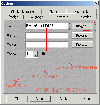 - 可注意到它有三栏,如果你的残局库都放在同一个目录里,可以只在第一栏填或按选残局库路径,否则可填更多路径。残局库是可以分放在不同路径的,目的是可临时手工选择使用哪些。那里还可顺便设残局库缓存数目。