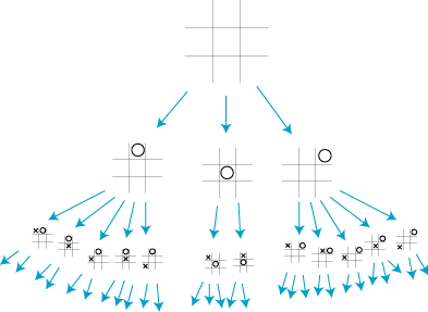 - 任何棋类游戏都要定义一棵有根的树(即“博弈树”),一个结点就代表棋类的一个局面,子结点就是这个局面走一步可以到达的一个局面。例如下图是井子棋(Tic-tac-toe)的搜索树: