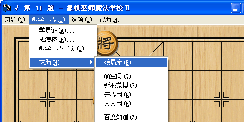 - 当象棋巫师魔法学校的某道残局习题困扰着您,可以使用教学中心菜单的求助功能并选残局库,打开残局推演页面。