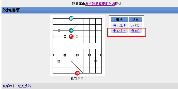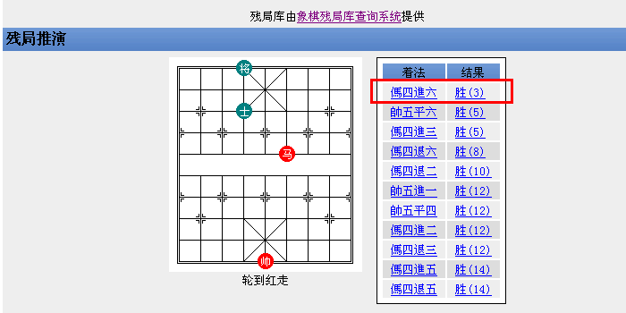 - 在残局推演页面中,棋盘右侧列出红方所有的走法,找到红方能获胜并且步数最少的走法(马四进六)。