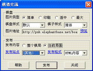 - (3) UBB文本:用UBB标记在文本中插入图片、链接,产生图文并茂的效果。目前大多数论坛都支持UBB文本,如果您在Discuz论坛、象棋专业论坛上发布棋谱,建议用UBB文本试试。